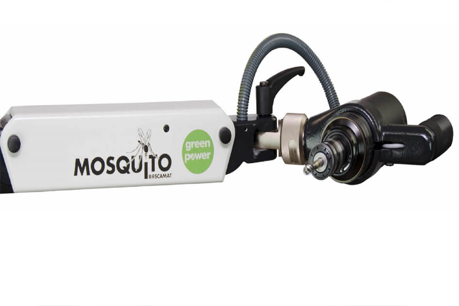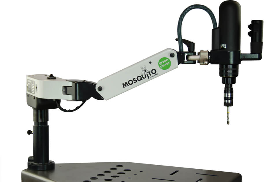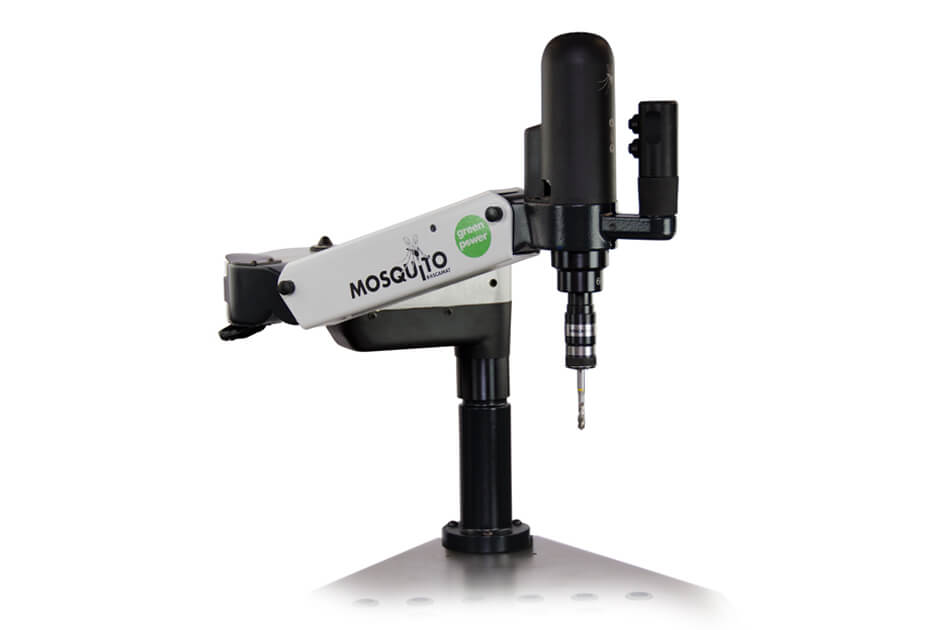 Im Vergleich zu pneu­ma­ti­schen Gewin­de­schneid­armen hat der Mosquito mit seinem elek­tro­ni­schen Antrieb eine deut­lich gerin­gere Lärm­be­las­tung der Arbeits­um­ge­bung, einen nied­ri­geren Ener­gie­ver­brauch sowie einen wartungs­freien Motor. Ein weiterer wesent­li­cher Vorteil ist die stufen­lose Dreh­zahl­re­gu­lie­rung bei glei­cher Krafterzeugung.