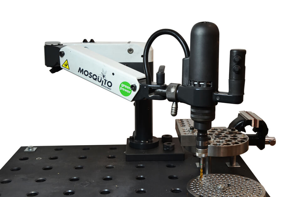Mit der  kompakten, elek­tri­schen Gewinde­schneid­maschine Roscamat Mosquito lassen sich sehr leicht und sicher Gewinde in Alumi­nium, Stahl oder Kunst­stoff schneiden. Auch sehr kleine Gewinde wie M2/M3 sind mit dem  ausba­lan­cierten, verwin­dungs­steifen und exakt im 90° Winkel ausge­rich­teten Gewin­de­schneidarm kein Problem für Sie. Durch den effi­zi­enten wartungs­freien Hoch­fre­quenz­motor und akkurat  einstell­bare Schnitt- und Rück­lauf­ge­schwin­dig­keit werden Gewinde von M2-M14 (Stahl) schnell und sicher geschnitten. Durch den schwenk­baren Gewin­de­schneid­kopf, schneiden sie auch problemlos hori­zon­tale Gewinde. Die sehr kompakte und platz­spa­rende Maschine kann über ein Klemm­system an fast jeder Arbeits­stätte ange­bracht werden, oder alter­nativ mit einer Adap­ter­platte an die Sieg­mund Schweiß und Spann­tisch­sys­teme befes­tigt werden.